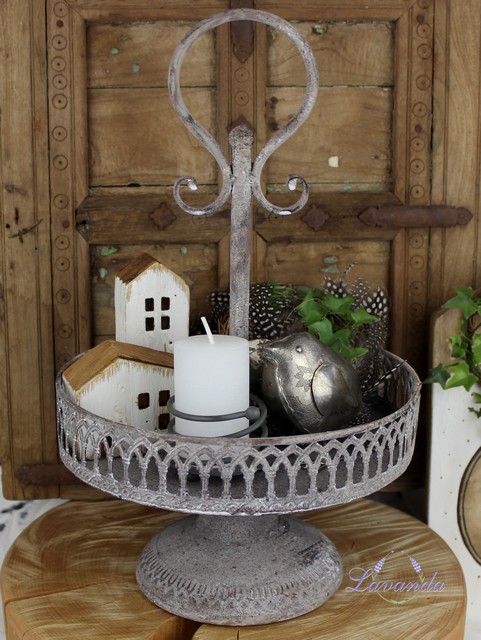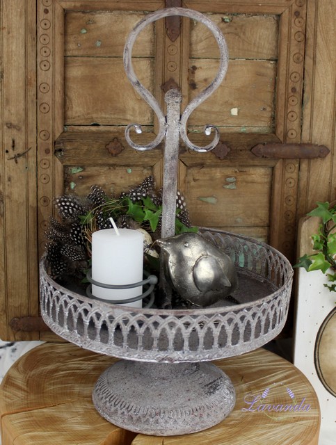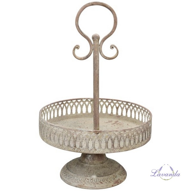 Krásny kovový etažér v štýle Shabby Chic, s výraznou patinou. Rozmer: 25 x 25 x 38 cm. Cena je za 1 ks.