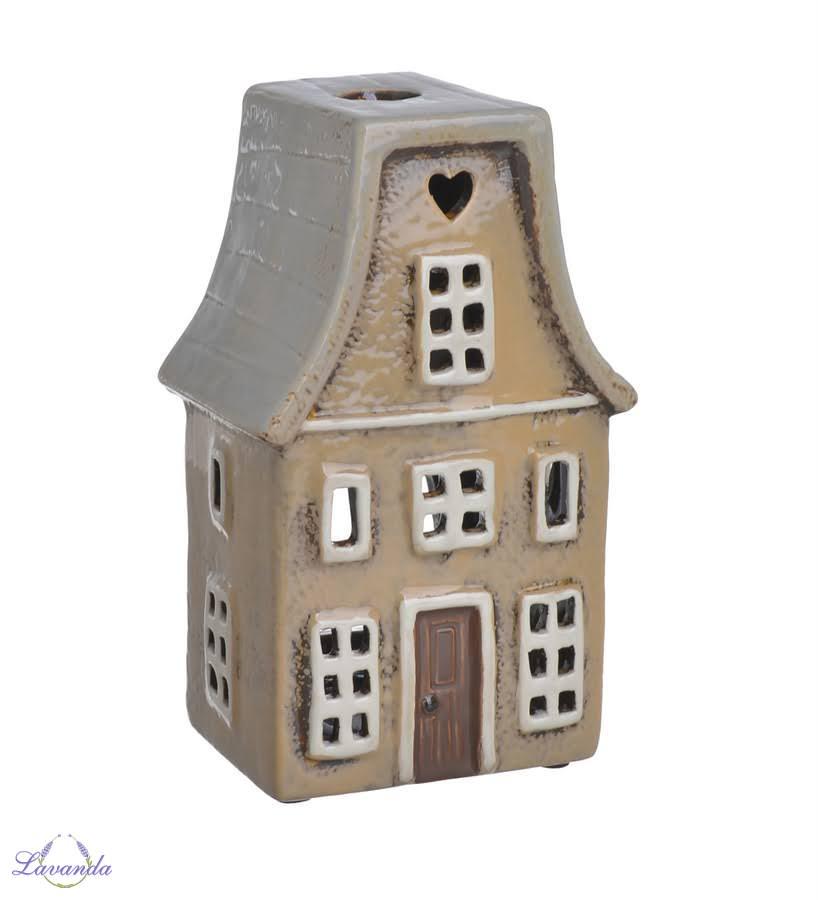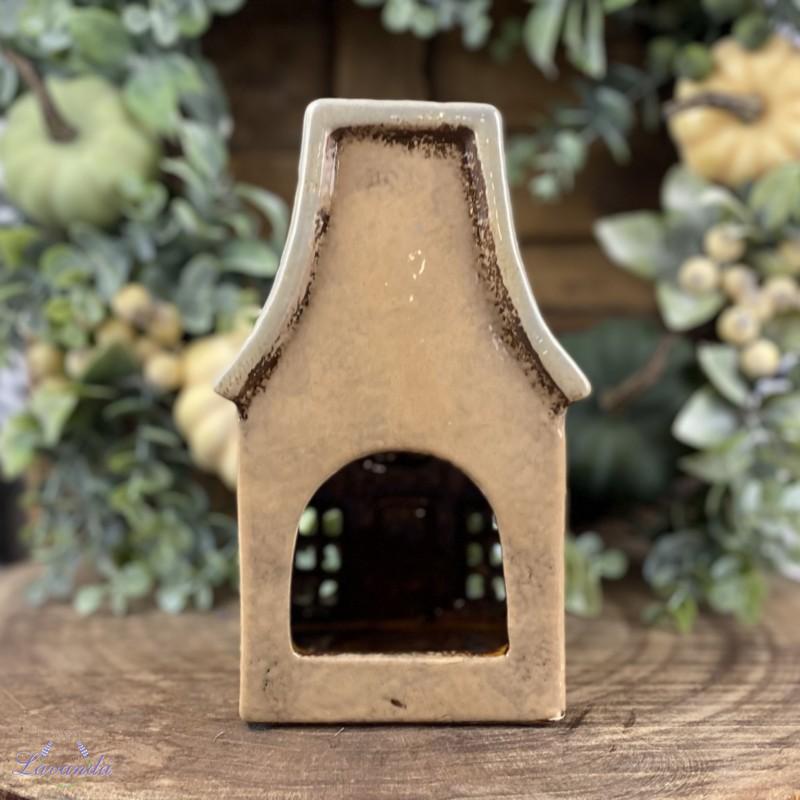 Keramická lucerna na čajové sviečky s krásnym dizajnom domčeka vo vintage štýle, lucerna v hnedej farbe s patinou. Rozmer: 11,3cm x 8,5cm x 18,7cm. Cena je za 1 ks.