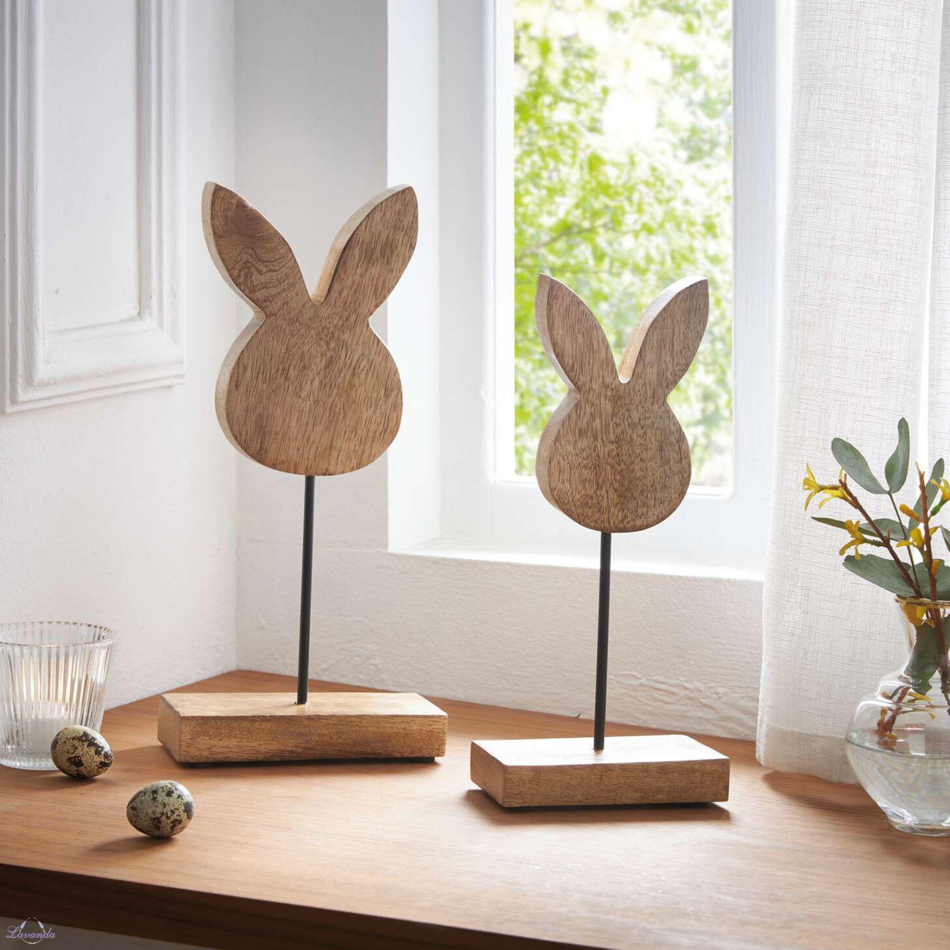 Krásne veľkonočné a jarné dekorácie, drevené zajačiky na podstavci . Rozmer: 25 cm, 29 cm. Cena je za sadu 2 ks.