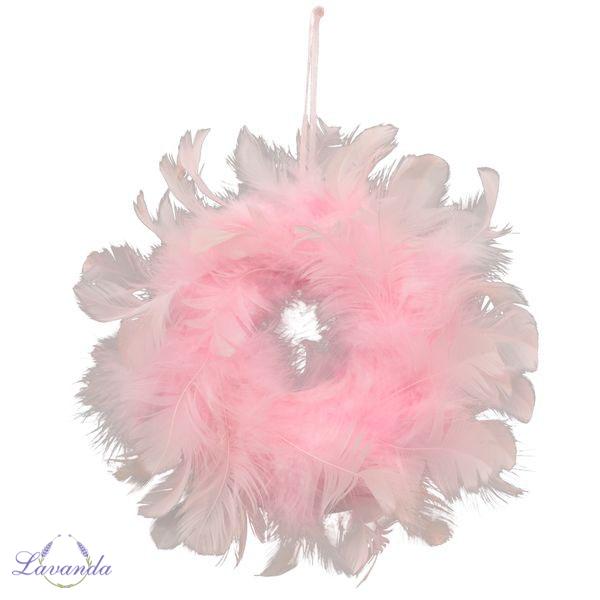 Dekoratívny veniec s pierkami, v ružovej farbe. Rozmer: 10 cm. Cena je za 1 ks.