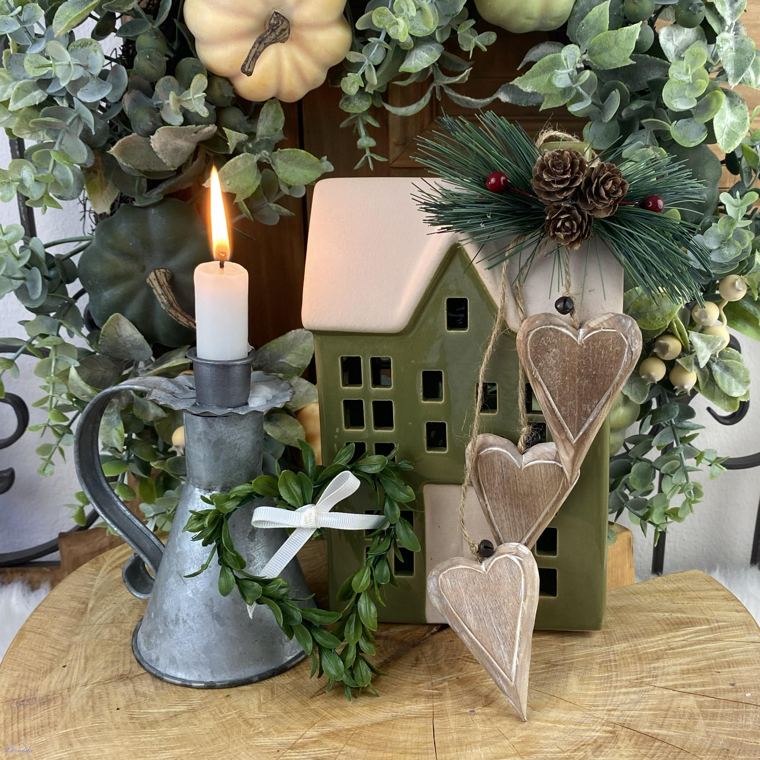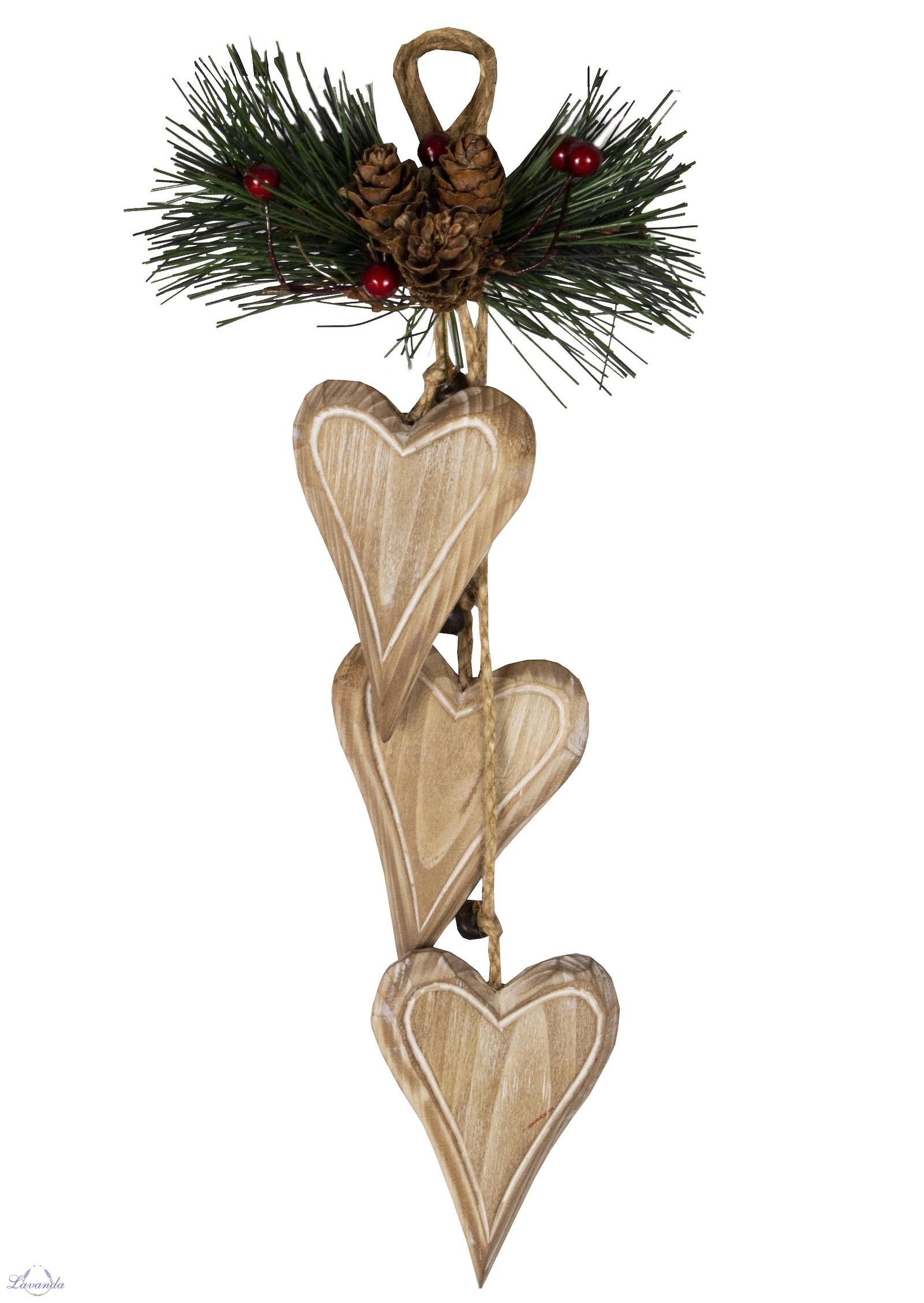 Vianočná girlanda s drevenými srdiečkami na zavesenie. Farba: hnedá, zelená s jemnou patina. Rozmer: 25cm . Retro dekorácia do haly, na terasu či do záhrady. Cena je za sadu.