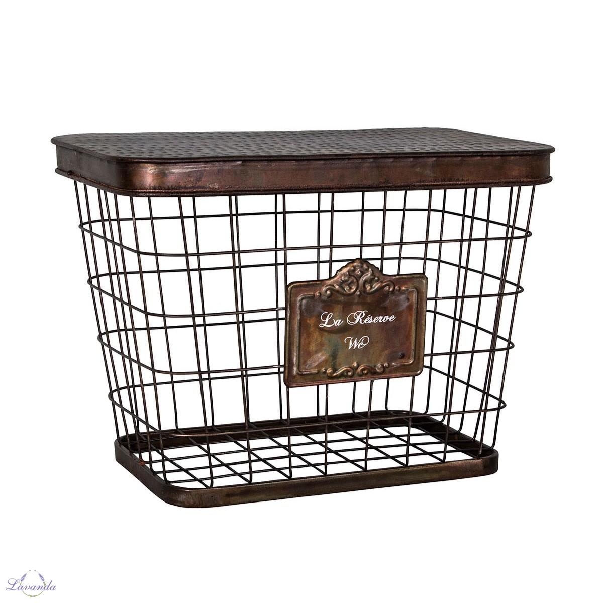 Krásny kovový košík " La Rezerve Wc" vo vintage štýle, s kovovým poklopom. Rozmer: 36 x 26x 23 cm. Cena je za 1 ks.