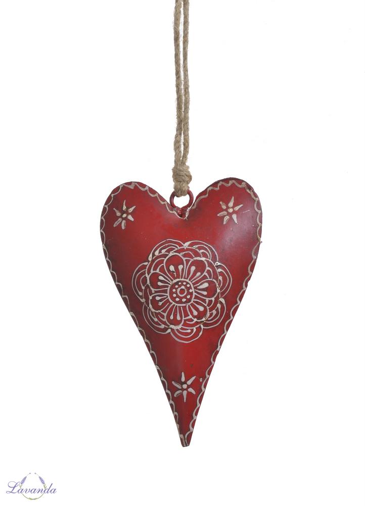 Kovová dekorácia srdiečko na zavesenie, v červenej farbe s bielym ornamentom. Rozmer: 9cm x 2,5cm x 14,5cm. Cena je za 1 ks.