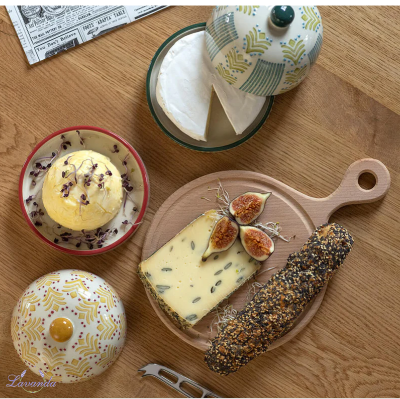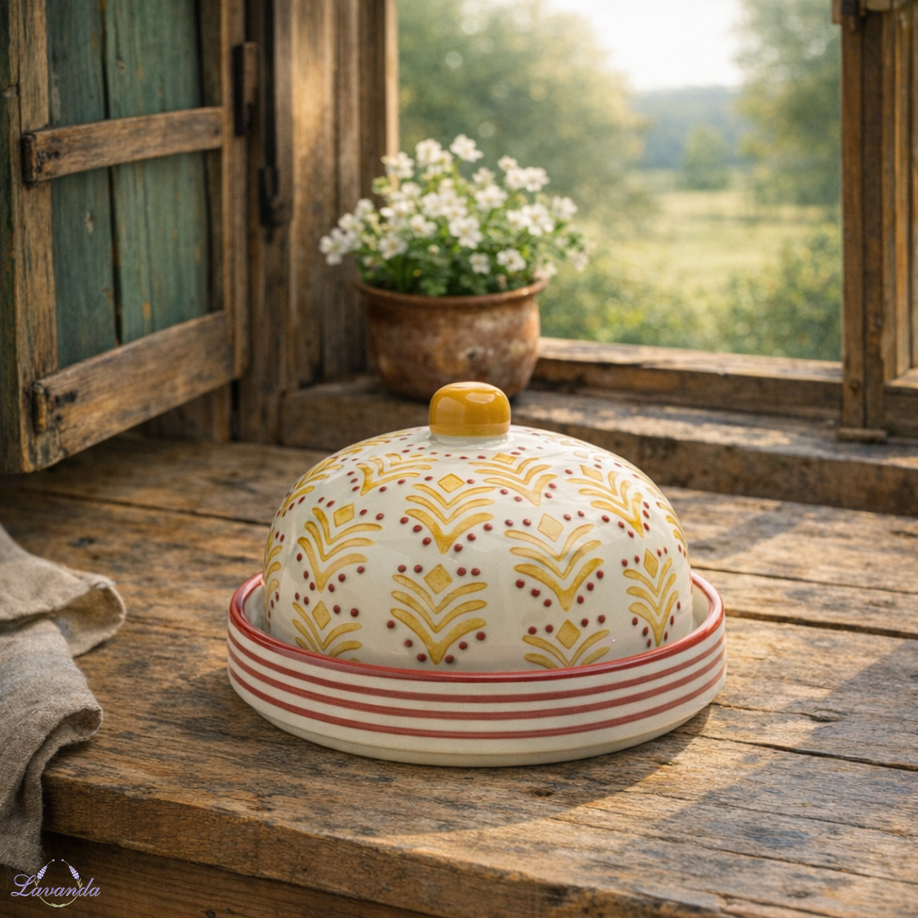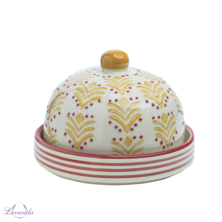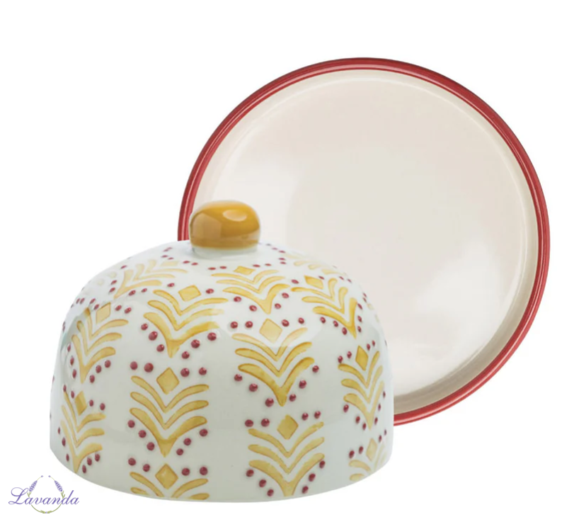 Tento ručne vyrobený poklop s podnosom je skutočným lákadlom pre gurmánov. S jeho starostlivo nanesenými vzormi a detailným dizajnom prináša eleganciu na každý stôl. Nádherné vzory dávajú tomuto užitočnému kuchynskému doplnku jedinečný, nostalgický nádych. Vyrobené z vysoko kvalitných materiálov, udržuje váš syr alebo maslo dlho čerstvé a dokonale ich chráni. Kombinácia funkčnosti a estetickej krásy, ktorá poteší každého milovníka masla či syra. Rozmer: Ø14 x 10 cm. Cena je za 1 ks.