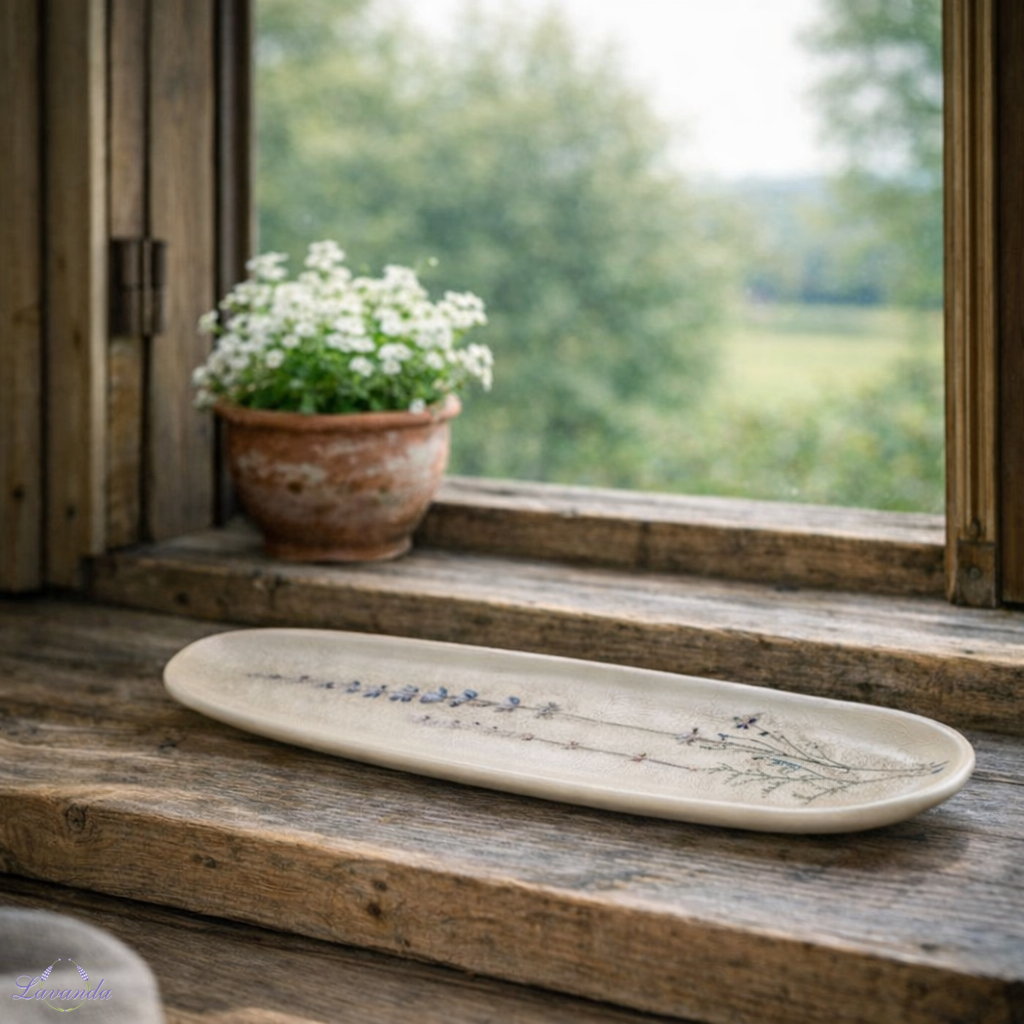 Kameninový podlhovastý servírovací tanier v provensálskom štýle, s krásnym dizajnom s kvietkami. Rozmer: 35.5 x 2 x 8 cm. Cena je za 1 ks.