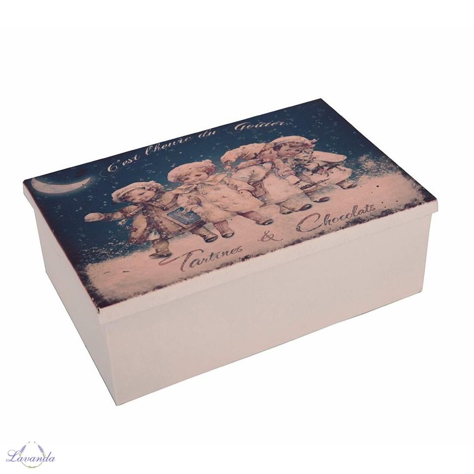 Krabička na koláčiky, čokoládky, drobnosti... Nostalgický vintage motív na vrchnáku. Rozmer: 21 x 7.8 x 14cm.