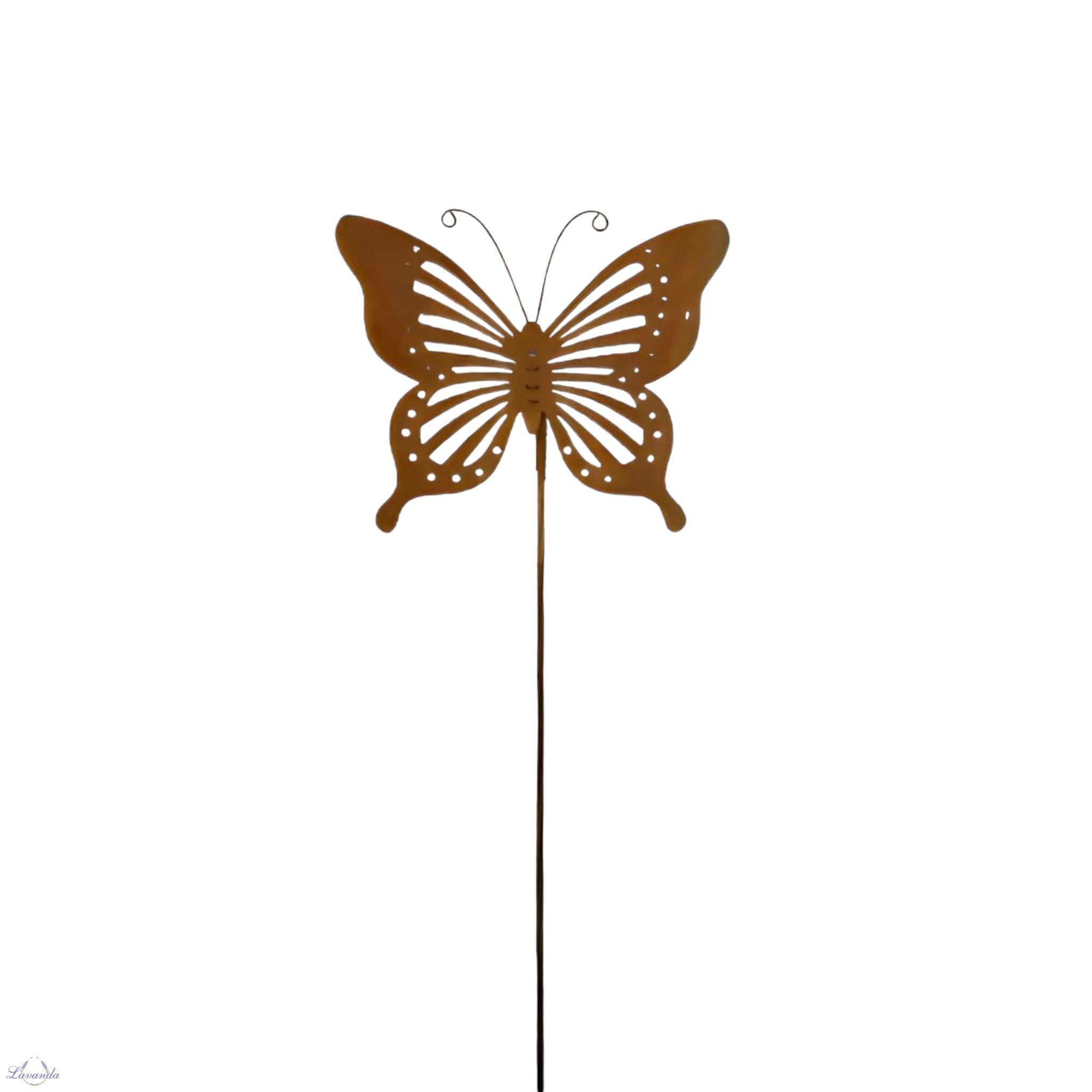 Originálna kovová dekorácia zo záhrady, na terasu či balkon. Motýľ na zapichnutie v hrdzavej patine. Rozmer: 61,5x13,5x1 cm. Cena je za 1kus.