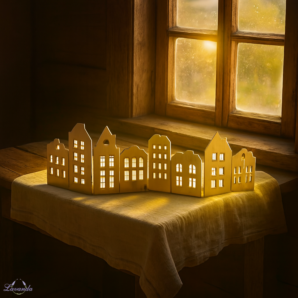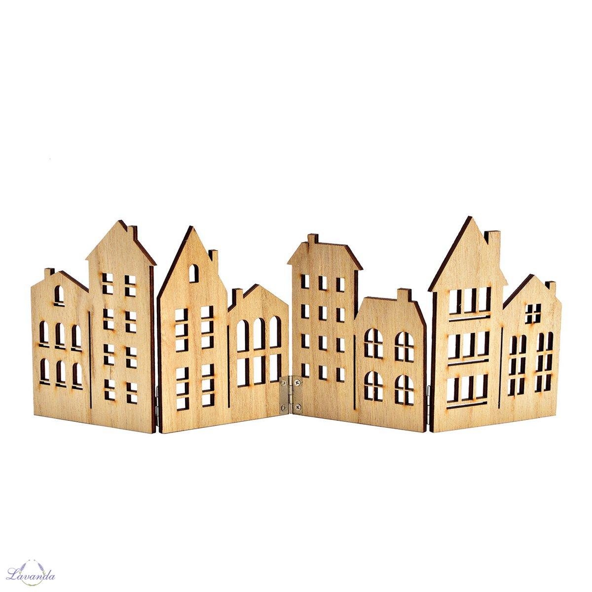 Originálna sada drevených dekoratívnych domčekov - Paravan. Sú navrhnuté tak, aby stáli samostatne ako dekorácie, a môžu byť elegantným doplnkom do akejkoľvek miestnosti. Detailné vzory a motívy na domčekoch im dodávajú jedinečný a umelecký vzhľad. Táto zástena z domčekov je skvelým spôsobom, ako vniesť do domu teplú a útulnú atmosféru.