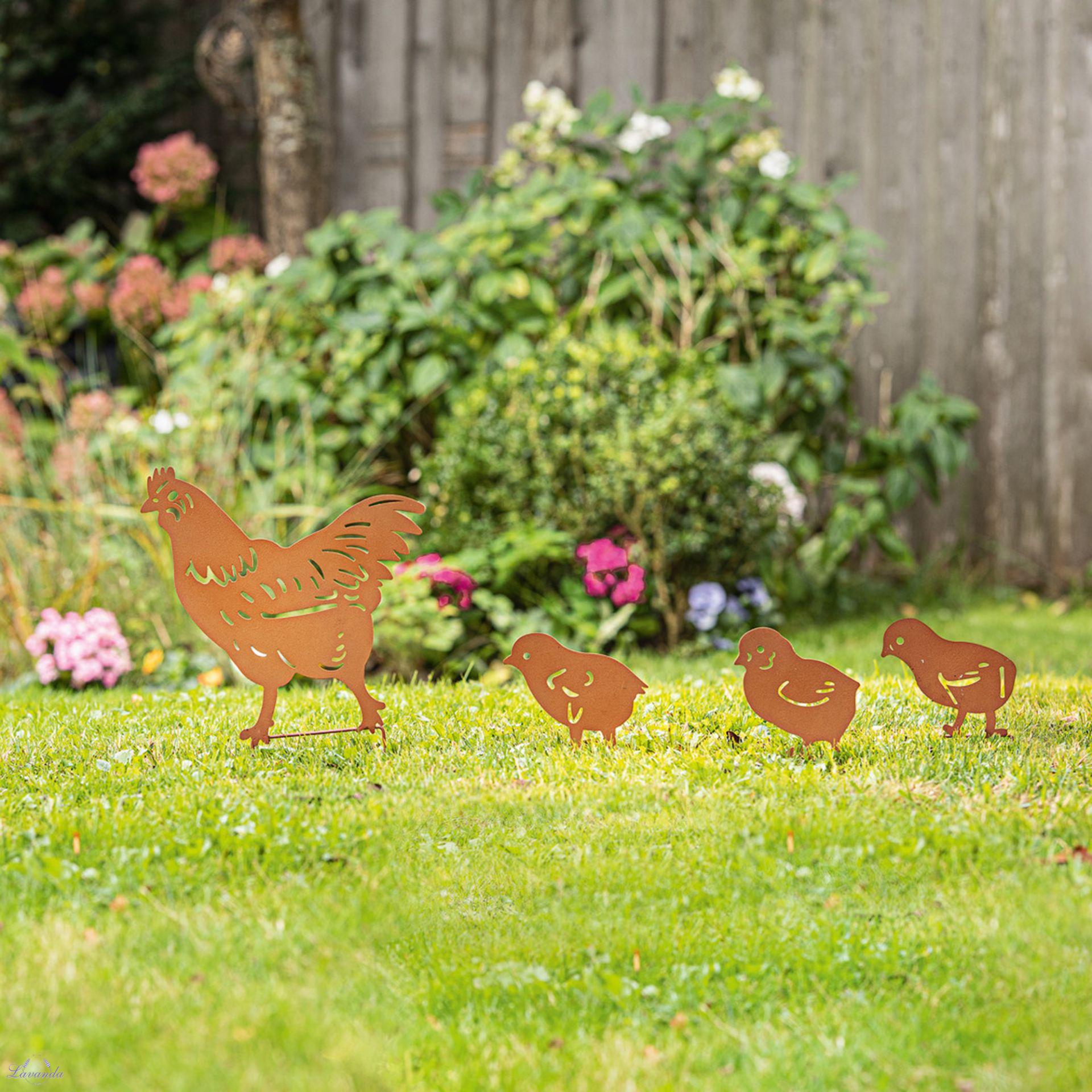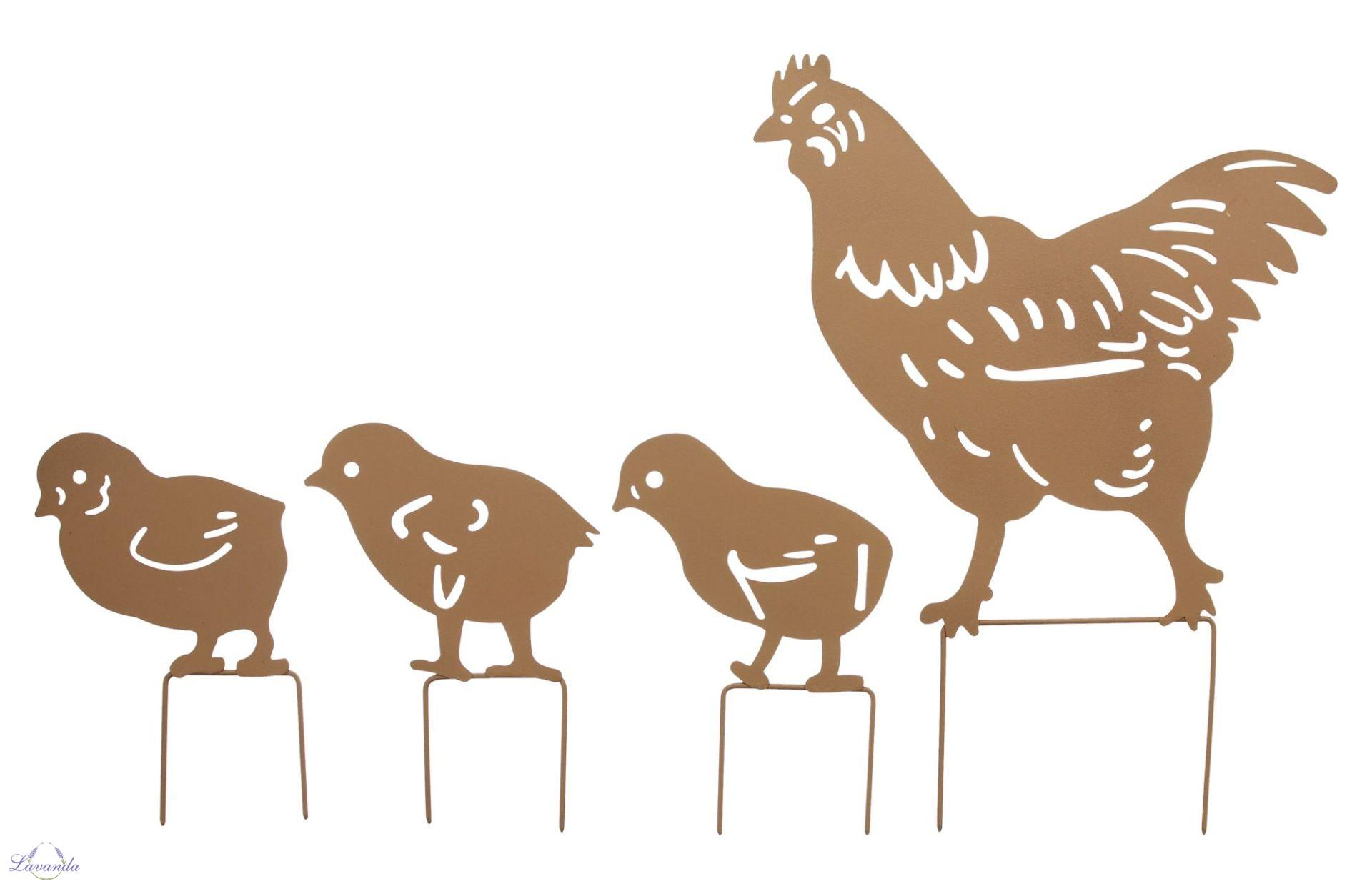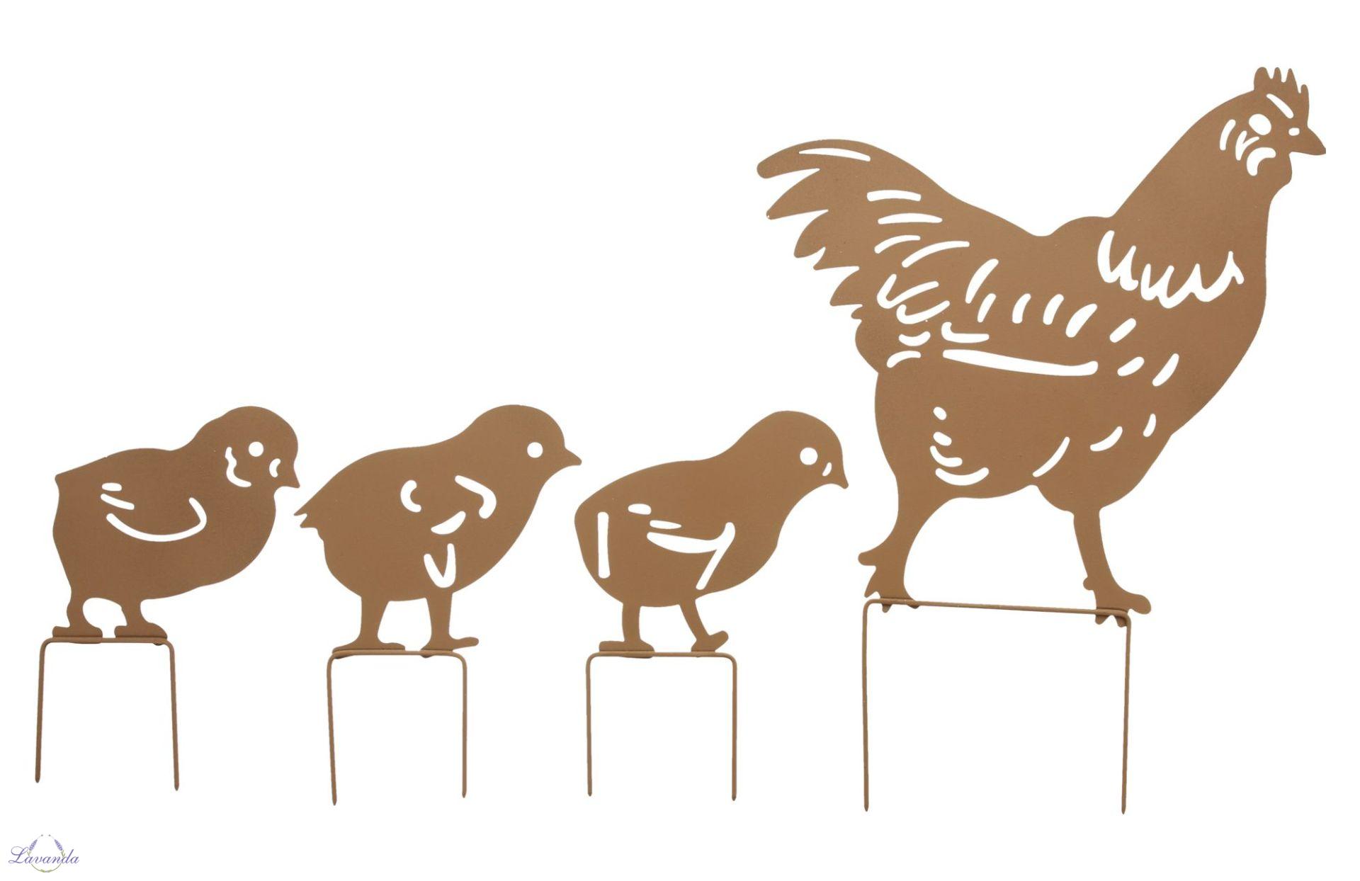 Originálna kovová dekorácia zo záhrady, na terasu či balkon. Sliepočka a kuriatka  na zapichnutie v hrdzavej patine. Rozmer: Sliepka 30 x 30 cm, kuriatka 14 x 12 cm. Cena je za 4 ks.